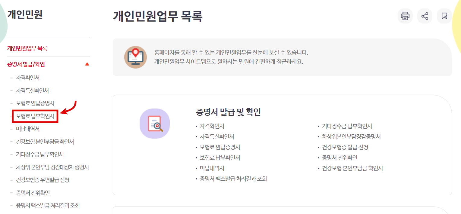 혹은 상단에 민원여기요의 개인민원을 클릭하시면, 좌측에 증명서 발급/확인이 있습니다. 해당 버튼을 누르시면 하위에 보험료 납부확인서가 있습니다.