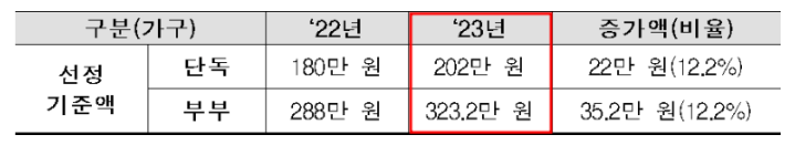 2022년 대비하여 수급금액이 2023년엔 5.1% 상승되었죠. 전년도 소비자물가변동률(5.1%)을 반영했다고 합니다.