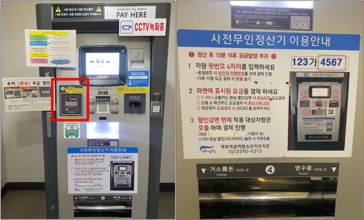 주차비 사전정산기 위치는 아래 사진에서 보신 바와 같이 개화역과 주차장을 이어주는 문 바로 맞은편에 위치하고 있습니다. 아이보리색 문을 열고 들어가셔야 사전정산기를 발견하실 수 있습니다.