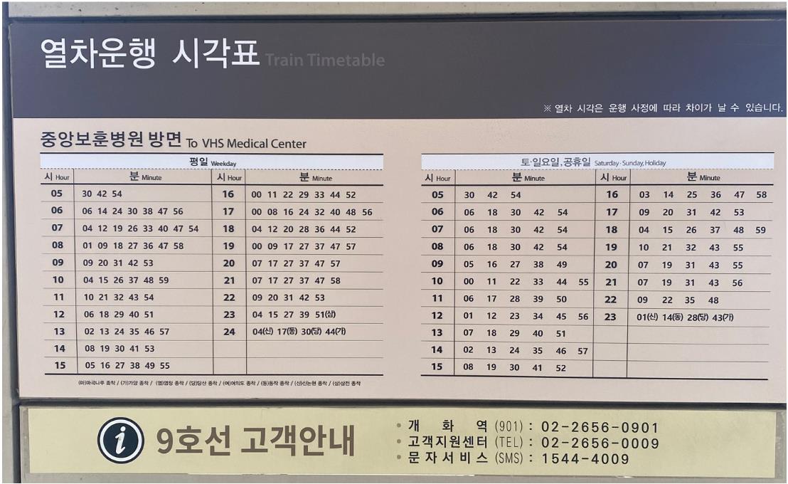 아래 사진은 개화역에서 출발하는 9호선 전철 시간표입니다.