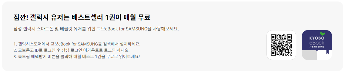 삼성 갤럭시 유저들은 매달 베스트셀러 1권씩 무료로 다운로드(다운로드한 날로부터 180일 동안 열람 가능) 및 읽기 서비스를 이용할 수 있습니다. 이 경우엔 어플을 교보eBook for SAMSUNG을 별도로 다운받으셔야 합니다. 갤럭시 유저들은 절대 놓쳐선 안될 혜택이네요!
