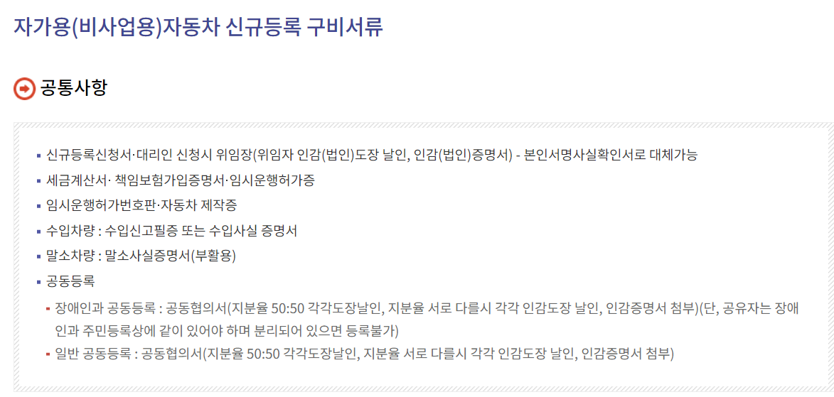 비사업용 자동차를 신규등록할 때 필요한 서류는 아래와 같습니다.