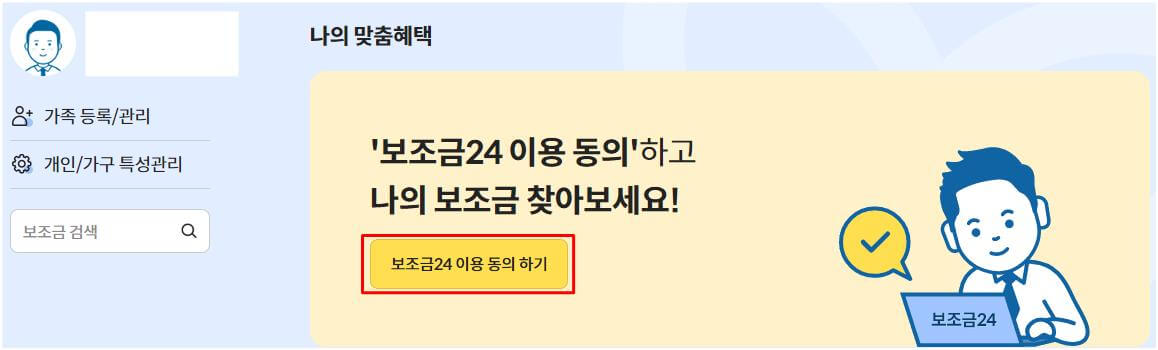 화면 중앙의 보조금24 이용동의하기를 클릭합니다.