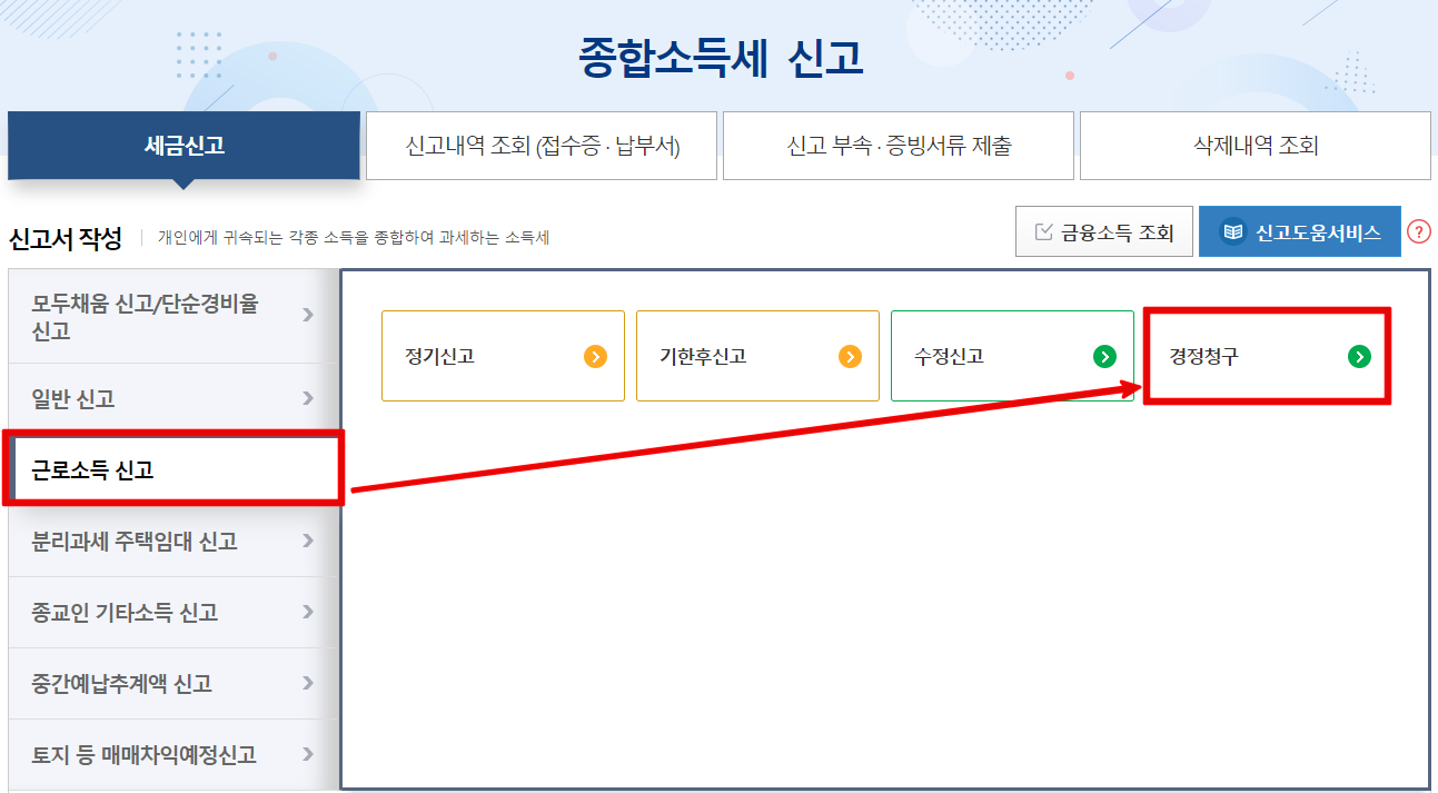 2) 종합소득세 신고화면에서 근로소득신고의 경정청구를 클릭합니다.
