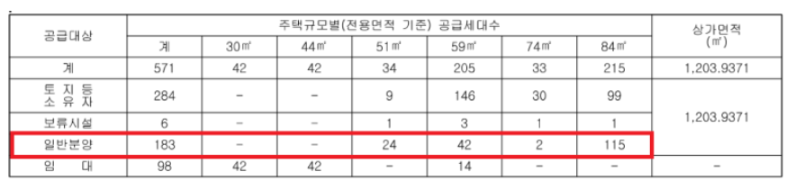 - 일반분양 물량: 183세대 (51㎡: 24세대 / 59㎡: 42세대 / 74㎡: 2세대 / 84㎡: 115세대)