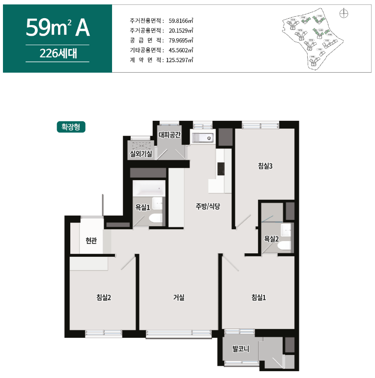- 평면별 세대수: 59A(226세대), 59B(35세대), 74A(152세대), 84A(188세대), 84B(152세대), 84C(18세대)