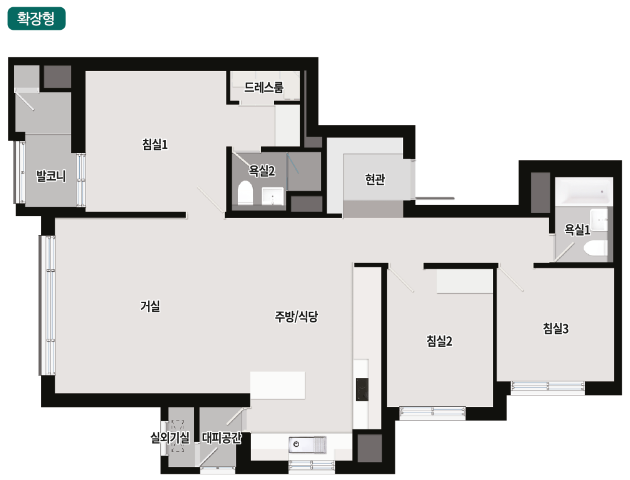 84의 모든 타입이 수납이 부족해 보이는 건 매우 아쉽습니다. 주방 식탁자리 쪽 벽이나 적당한 공간에 수납장을 좀 더 구성했으면 어땠을까 개인적으로 생각해 보았습니다.