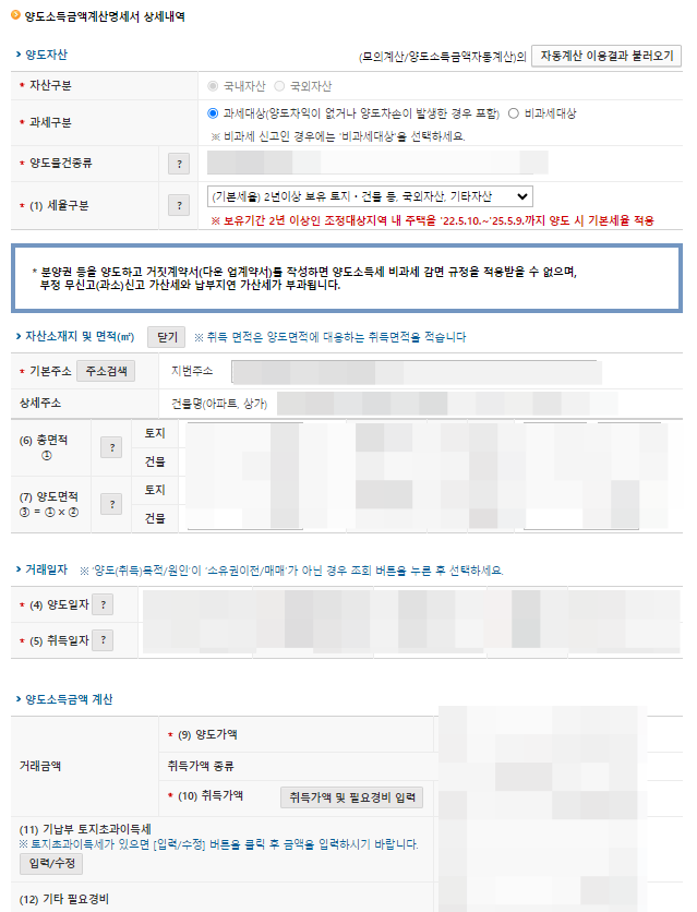 작년에 매도한 모든 부동산에 대한 양도소득금액 및 과세표준금액, 세율 및 산출세액을 확인하는 단계입니다.