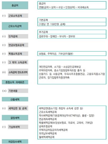 - 특별소득공제 : 건강보험료, 고용보험료, 주택임차 차입금의 원리금 상환액, 장기주택 저당차입급의 이자상환액