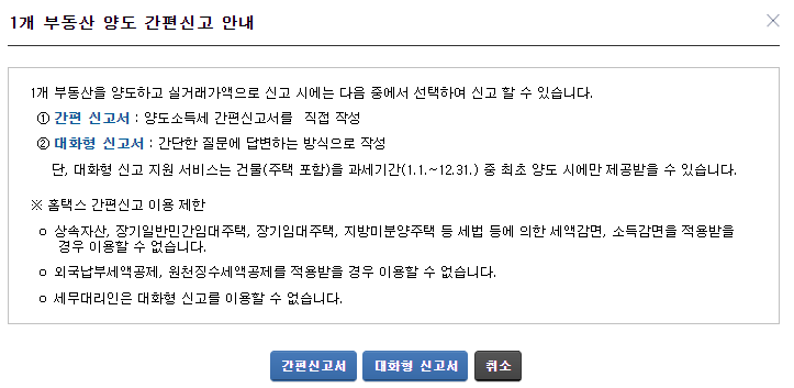 1개 부동산을 양도하고 신고할 떄는 간편신고서와 대화형 신고서 중 선택하여 진행할 수 있습니다. 간편신고서는 양도소득세 신고서를 직접 작성하는 방식이고, 대화형 신고서는 간단한 질문에 답변하는 방식으로 양도소득세 신고를 하는 방식입니다. 단, 대화형 신고서 작성방식은 과세기간 중 최초 양도시에만 작성하는 방식입니다.