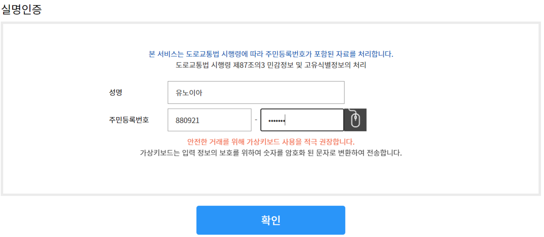 본인의 운전면허 정보가 뜨면 확인합니다.