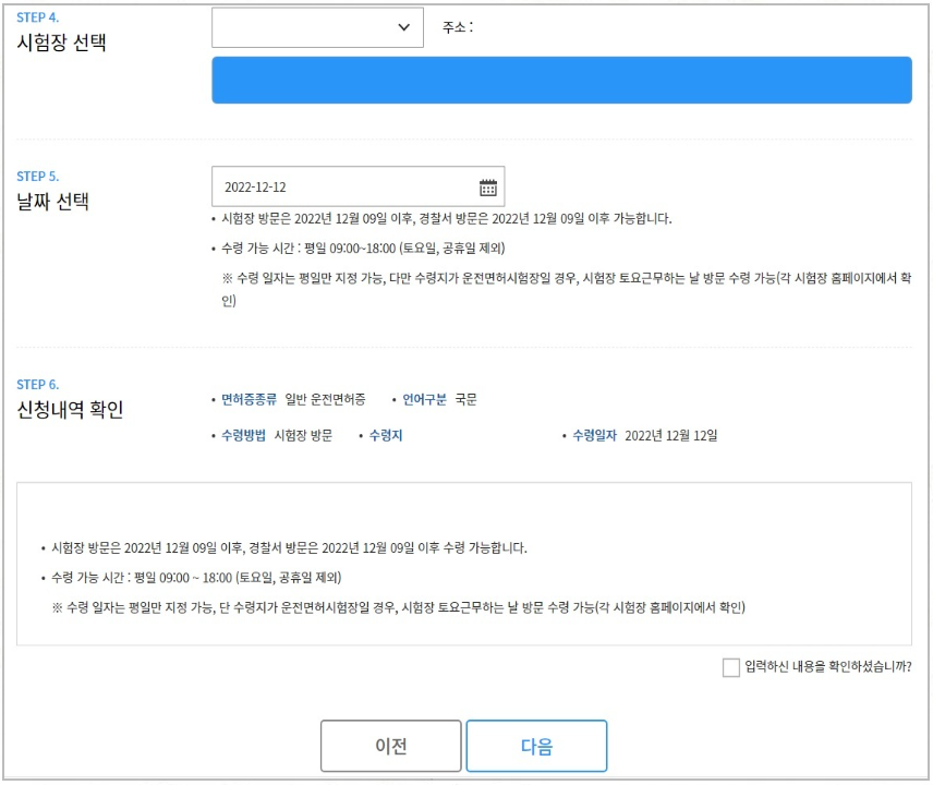 시험장을 선택했다면, 갱신된 면허증을 수령할 시험장 및 희망날짜를 선택하고 신청 내역을 마지막으로 확인합니다.