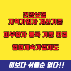 오늘은 의료보험 지역가입자 계산기준 및 피부양자 등록 기준 변경, 건강보험료 임의계속가입제도에 대해서 말씀드렸습니다. 특히나 경기가 어려운 시기에 건강보험료를 지역가입자로 내셔야 하는 분들께 유익한 정보가 되었으면 합니다.