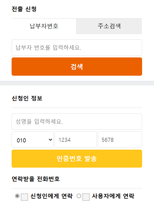 적어도 이사 2일전에는 사전예약을 하셔야 합니다. 예약 방법은 삼천리톡이나 홈페이지를 이용하시면 됩니다. 홈페이지에서는 아래와 같이 납부자 번호 혹은 주소를 검색하여 전출을 신청할 수 있습니다.
