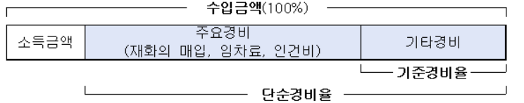 아래 그림과 같이 기준경비율의 경우 소득에서 주요경비를 제외하고, 기타경비를 산출하기 위해서 기준경비율을 곱하여 제외하는 방식입니다.