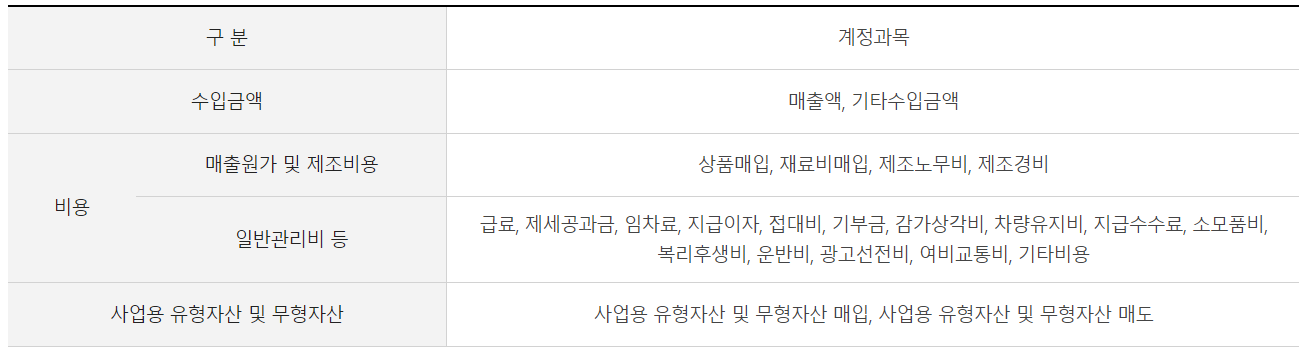 - 계정과목: 거래별로 아래를 참고하여 계정과목을 기입합니다.