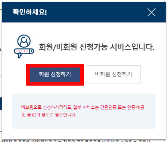 회원 혹은 비회원 신청하기가 뜨는데, 비회원신청을 클릭해도 결국엔 간편인증을 해야 하므로 [회원 신청하기]를 클릭하시길 바랍니다.
