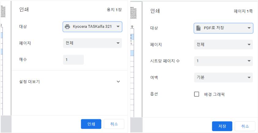 프린터기가 연결되어 있다면 즉시 인쇄도 가능하며, 인쇄 대상 옵션에서 PDF로 저장하기를 클릭하면 출력이 아닌 PDF 파일로 저장하실 수 있습니다.