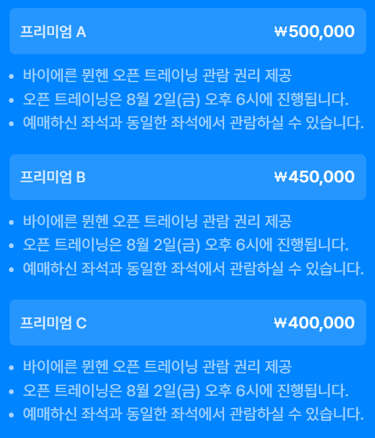 프리미엄 A, B, C에는 특별한 혜택이 제공 됩니다. 토트넘과 K리그 경기 전날인 7월 30일에 오픈 트레이닝은 동일한 좌석에서 관람하실 수 있습니다.