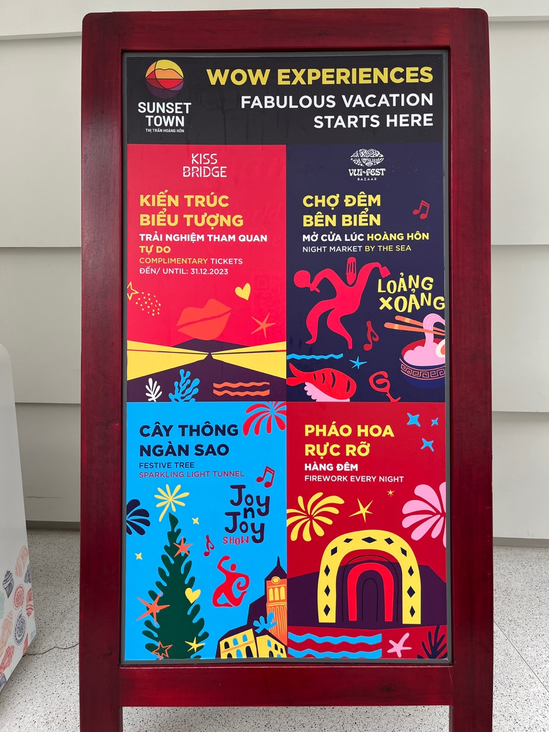 선셋타운 부이페스트 광고 안내판엔 왼쪽 상단부터 차례로 키스 더 브리지 / 바다 옆 나이트마켓(야시장) / 반짝반짝 화려하게 장식된 나무들과 길들 / 매일 밤 열리는 불꽃놀이를 홍보하고 있습니다.