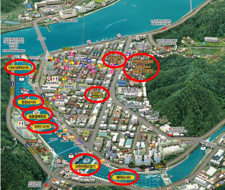 포스팅 상단의 [1번 축제관련 기본 정보 - 4) 즐길거리]항목의 '화천 산천어 축제 지도'에서 예약 낚시터의 위치를 확인하실 수 있습니다.