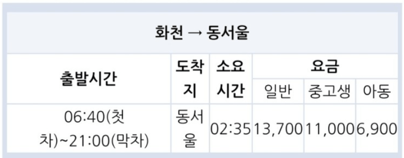동서울 버스터미널과 춘천 버스터미널에서 탑승할 때 기준으로 안내드립니다.