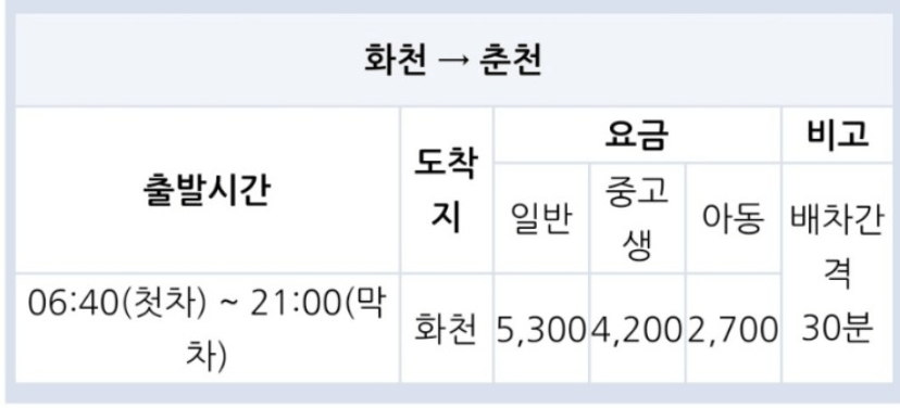 아래 표에서 요금과 배차간격, 막차 시간, 그리고 춘천역에서 목적지로 돌아가는 기차 시간을 꼭 확인하시길 바랍니다.