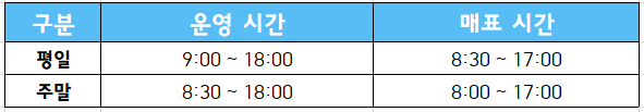 매표시간은 운영 시작 시간보다 30분 먼저 시작되고 종료 시간보다 1시간 먼저 종료됩니다.