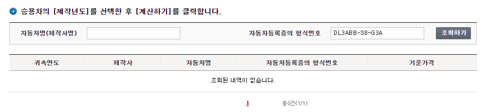 단, 홈택스에서 확인할 때는 다소 불편한 점이 있습니다. 바로 형식번호를 정확히 모르면 찾기가 어렵다는 점입니다. 저의 경우도 자동차등록증에 나와있는 형식번호와 시가표준액 표에 나와있는 형식번호가 달랐는데요. 이런 경우 아래와 같이 조회자체가 불가능할 수도 있습니다.