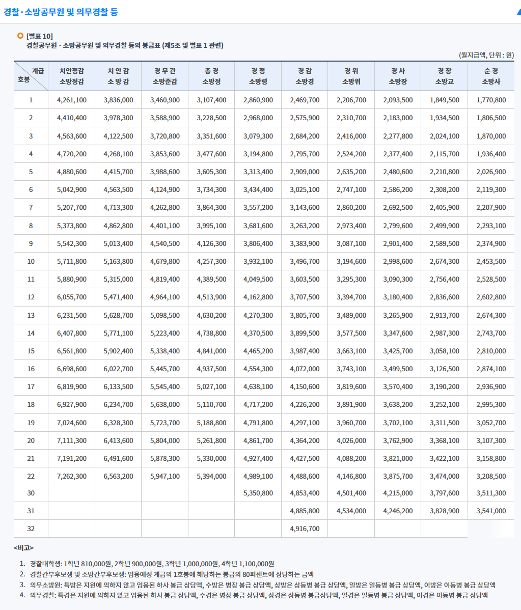 인사혁신처에서 발표한 2023년 경찰 공무원과 소방공무원, 의무경찰 등의 호봉(봉급)표는 다음과 같습니다.