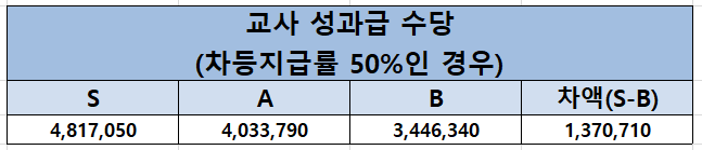 아래 표는 차등지급률 50%인 경우 지급받는 2022년 교사 성과급 수당입니다.