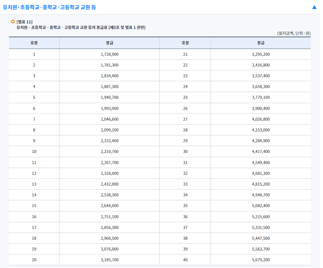 그래서 호봉표에는 1호봉부터 40호봉까지 명시되어 있지만 실제로 1호봉에서 시작하는 교사는 없습니다.