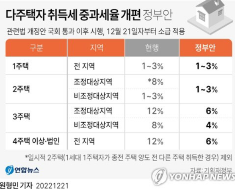 2022년 12월 21일 수요일에 행정안전부에서 부동산 취득세율을 완화하는 개정안을 발표하였습니다. 조정지역대상에서는 2주택부터 취득세가 중과되었기에 주택구입에 부담을 느끼고 일시적 1가구 2 주택 제도를 택하여 취득세 감면 혜택을 받곤 했었죠.