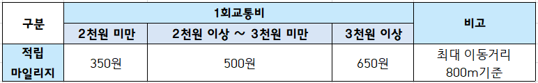 - 800m미만은 이동거리에 비례하여 마일리지가 지급됩니다.